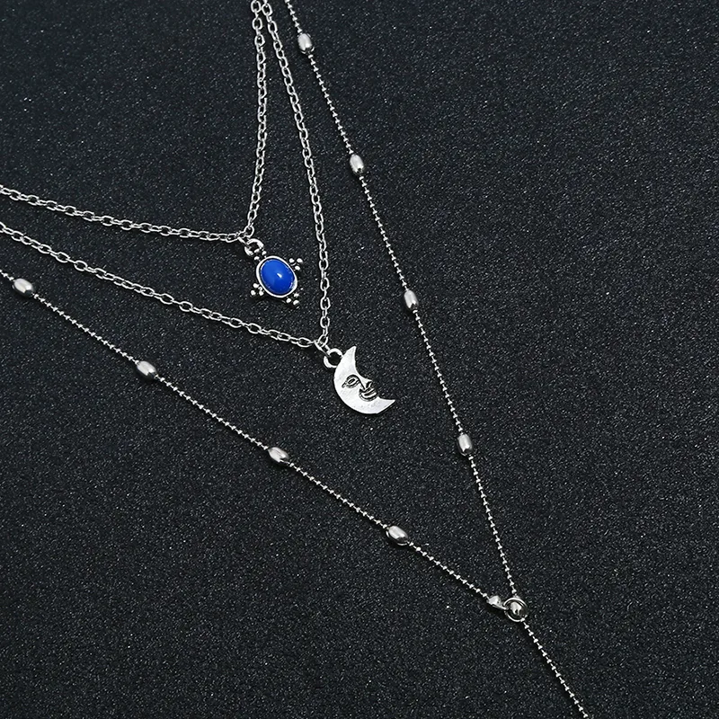 Blue Stone Necklace Triple Layered Moon Pendant