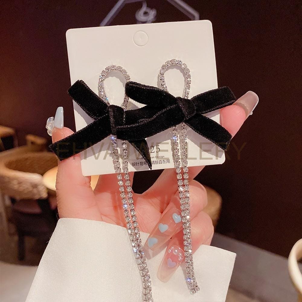 Korean earrings, party earrings, rhinestone earrings, bow jewellery , bow earrings , black earrings, long earrings.
