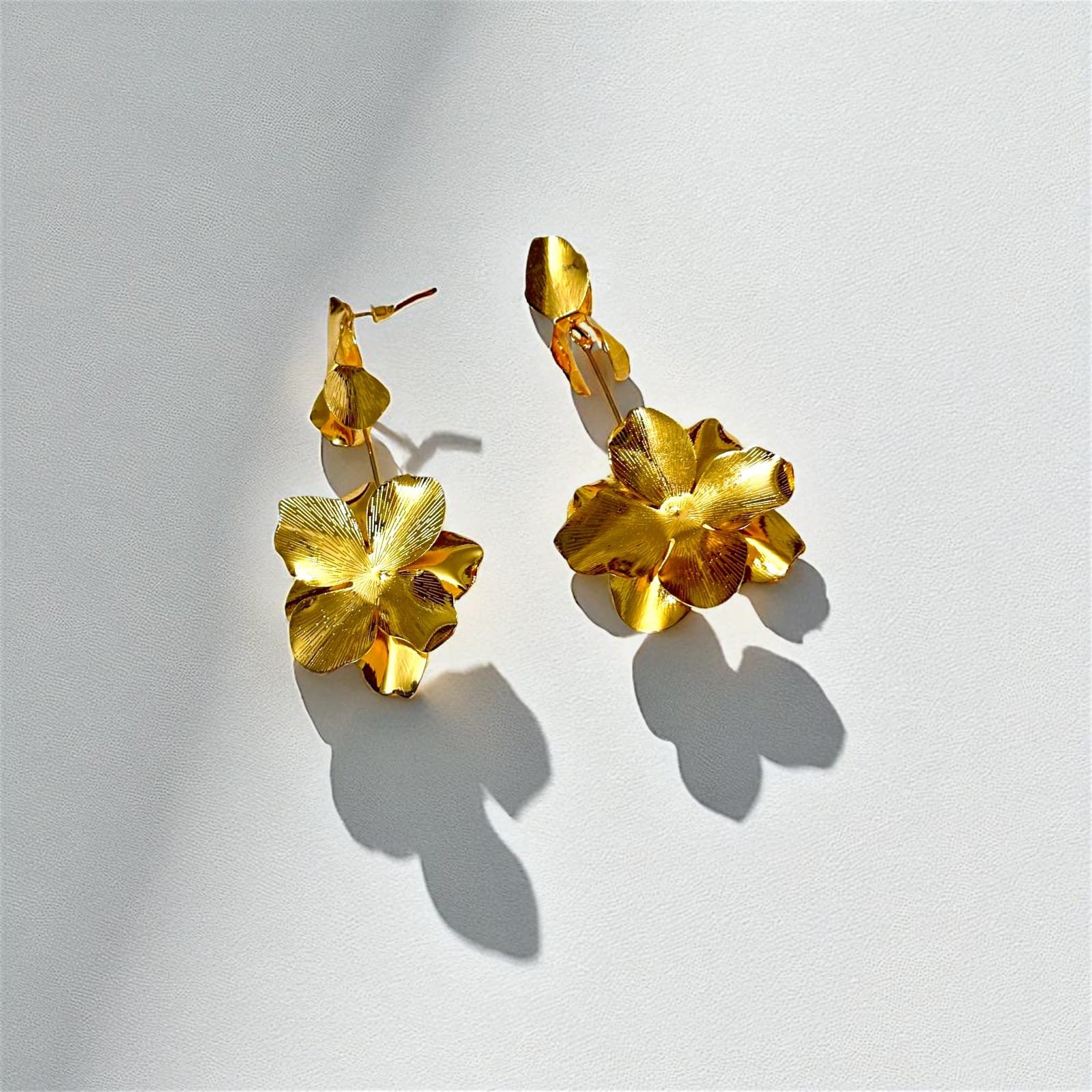 These earrings feature a beautifully sculpted multi-petal flower crafted in premium gold-plated metal, giving a luxurious and modern appeal.