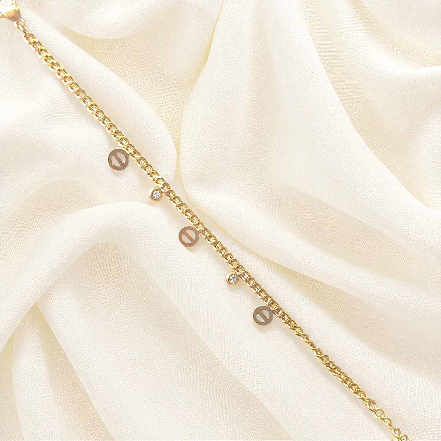 This bracelet features a delicate chain adorned with tiny gold-plated charms and sparkling cubic stones, adding subtle shine to your everyday look. Its adjustable fit ensures comfort, while the premium stainless steel base prevents tarnish and retains its shine for years.