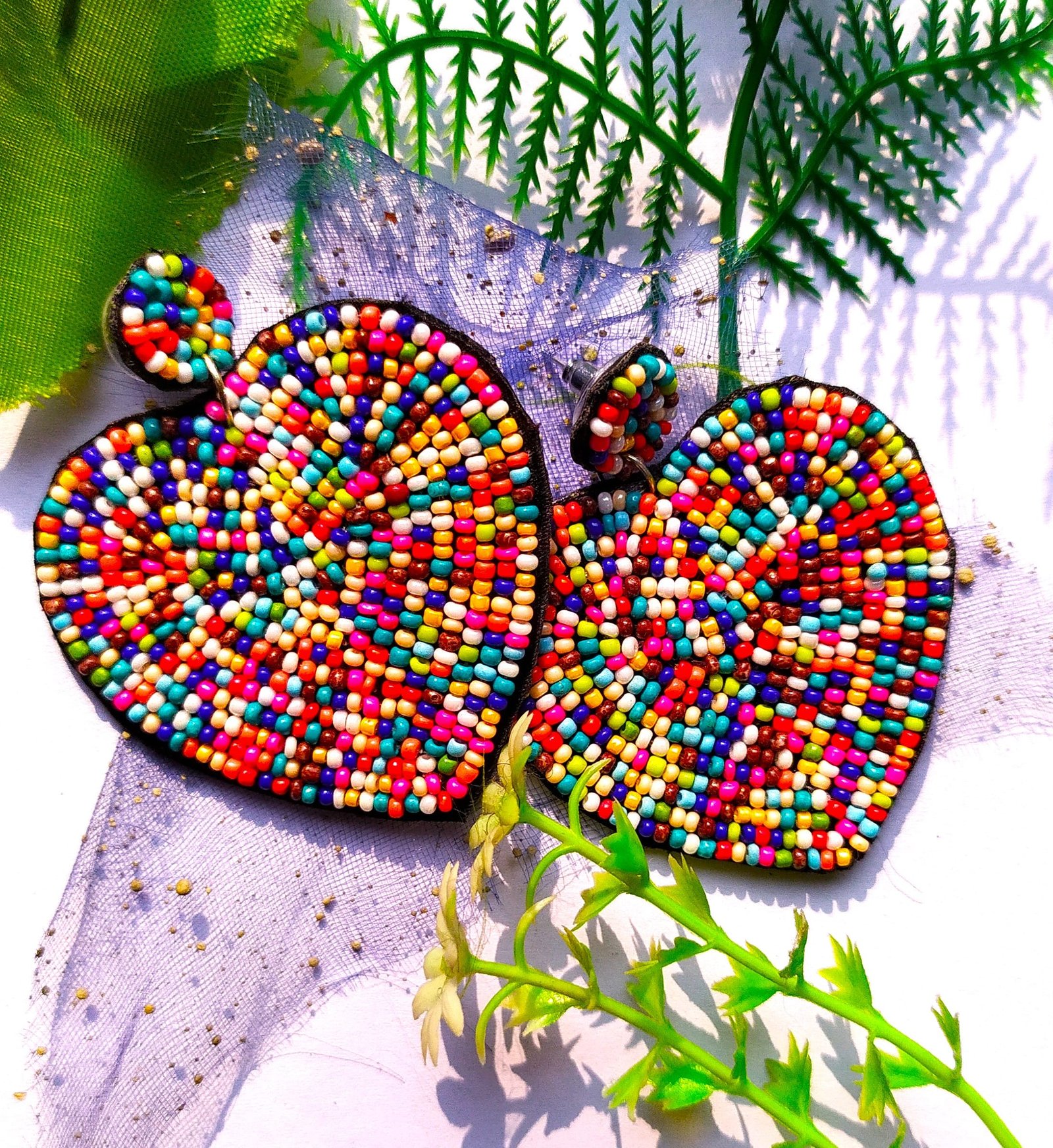 **Heart-Shaped Beaded Earrings**: These stunning earrings are handcrafted in a charming heart shape, perfect for adding a touch of elegance and whimsy to any outfit. The design features tiny, meticulously woven glass seed beads that form the outline and fill the heart, creating a beautiful and eye-catching pattern. The earrings often showcase a blend of vibrant colors such as red, pink, gold though they can be customized to match any palette.