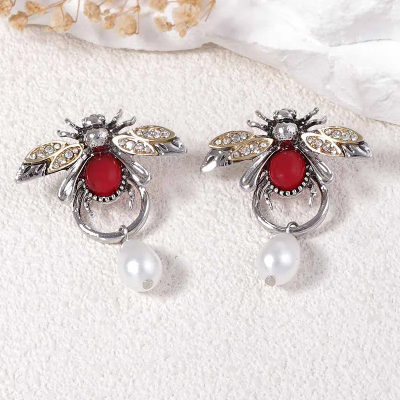 Shop elegant Silver Honey Bee Earrings with red stone,shiny zircon and pearl drop design. Perfect for festive and casual looks. Lightweight, stylish, and beautifully crafted.