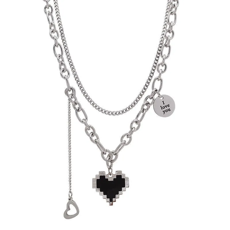 This necklace features two layered chains: one with a mosaic-style black heart pendant that symbolizes strength in love, and the other with a “Love You” engraved charm that adds a sweet, personal touch.